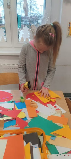 Podczas zajęć z projektu "Świetliczaki na tropie zagadek" dzieci zapoznały się z pojęciem „Mimikry”. Aby wyjaśnić owe pojęcie, uczyliśmy się na wybranych przykładach zwierząt występujących w przyrodzie, przy pomocy prezentacji multimedialnej. Kolejną częścią zadania było wspólne zrobienie dużego plakatu „Kameleon” za pomocą mozaiki – wyciętych różnorodnych prostokątów z kolorowego papieru.